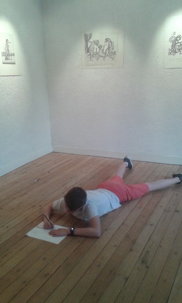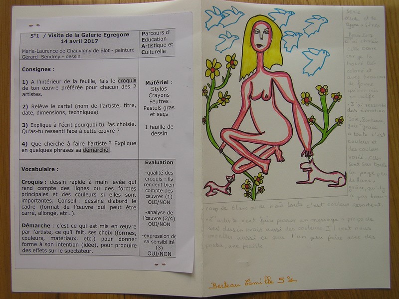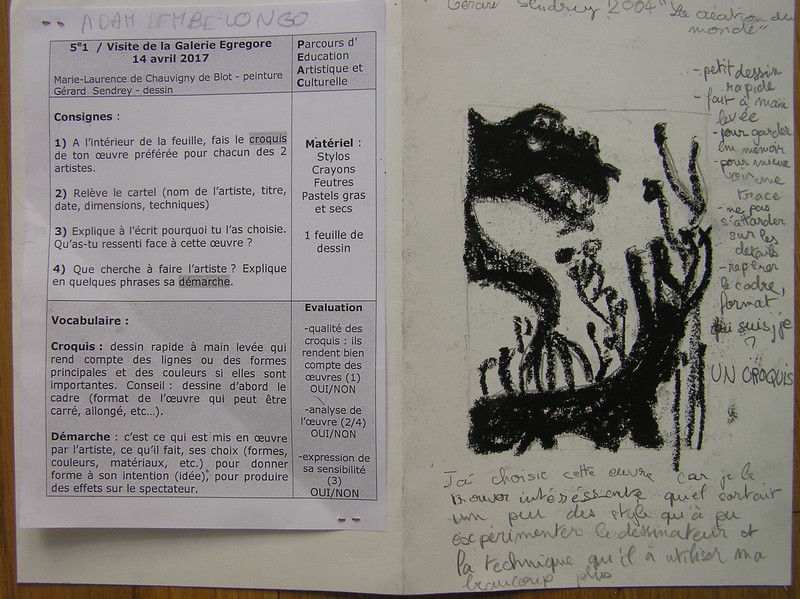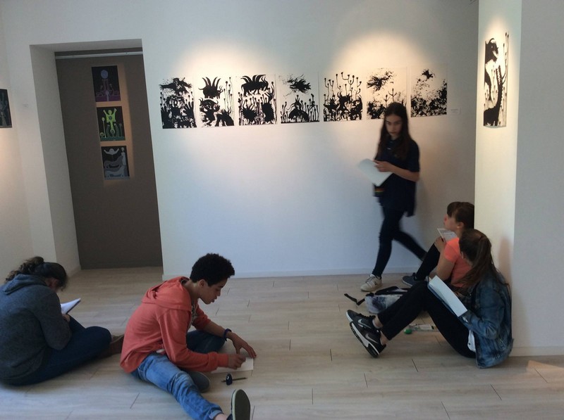 Le vendredi 14 avril dernier, les élèves de 5e1 profitaient d’une visite à la galerie Egregore pour découvrir et étudier en pratique l’œuvre graphique de Gérard Sendrey, artiste autodidacte dont la galerie Egregore présente une rétrospective réjouissante jusq’au 28 mai. Des dessins au Posca, à l’encre, au stylo bille et même au noir de fumée, gauffrage, coulures, jeux de lignes, sur papier, carton, feutrine ou sur papier photo, en couleur ou en noir et blanc, nous avons pu faire l’expérience d’une démarche riche et extrêment variée basée sur la représentation des figures humaines, l’expérimentation et le jeu : une expo étonnante et communicative !