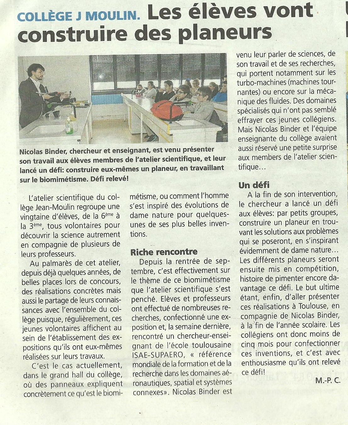 Lors de sa venue le 14/01, Nicolas Binder, enseignant chercheur de l’école supaéro Toulouse, a proposé aux élèves de l’atelier de construire un planeur. Les élèves se répartiront en équipes mixtes pour répondre aux contraintes du règlement, et iront à Toulouse présenter leurs prototypes à M. Binder. L’occasion rêvée de découvrir une école renommée et de comprendre encore mieux l’influence du bio mimétisme dans l’aérospatiale.