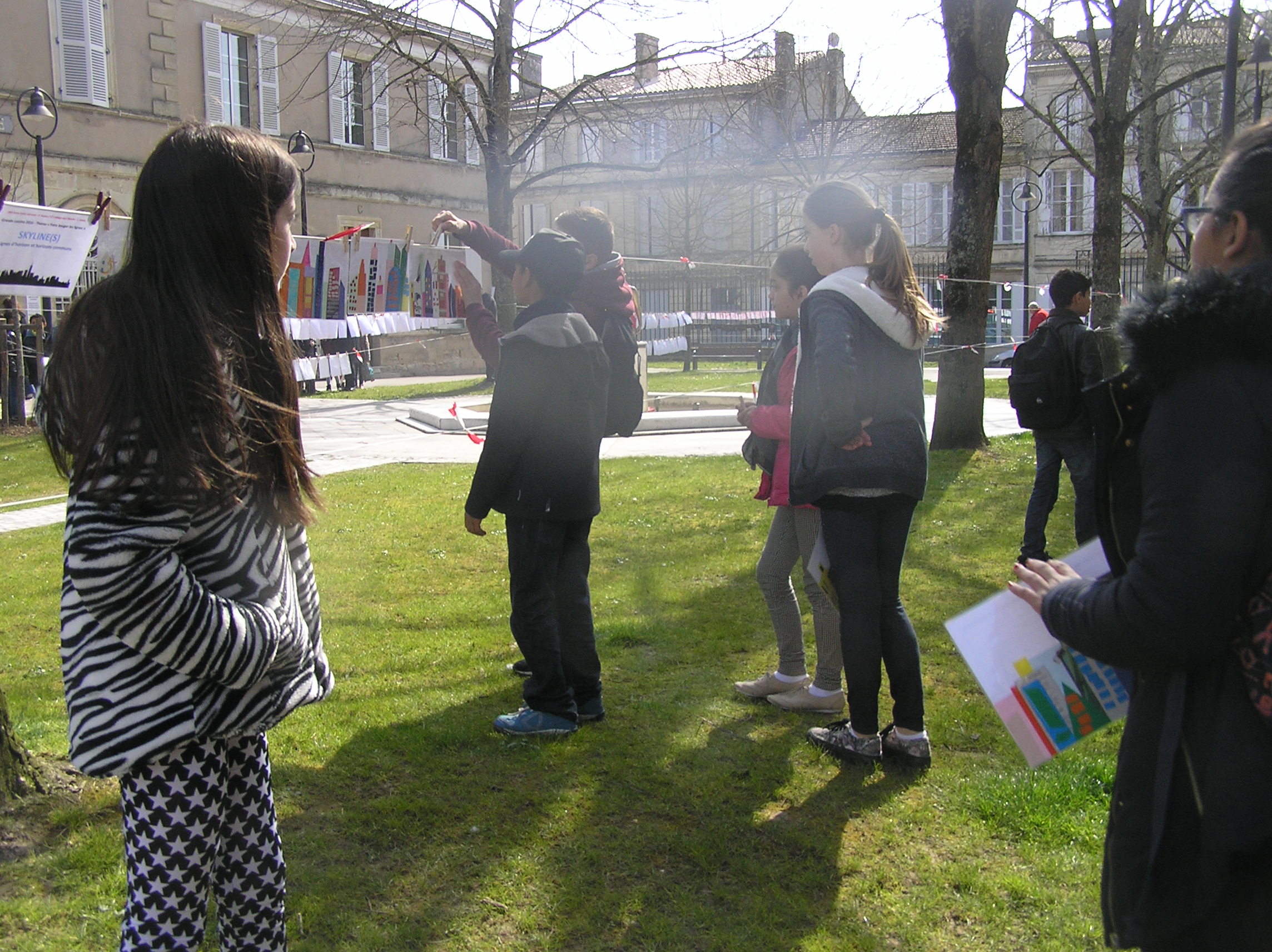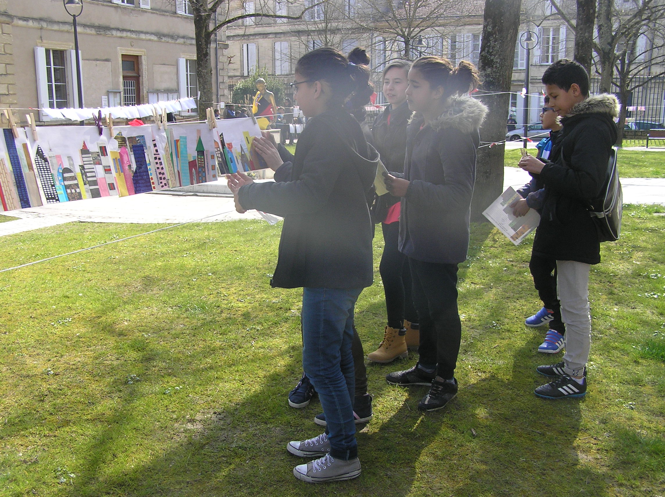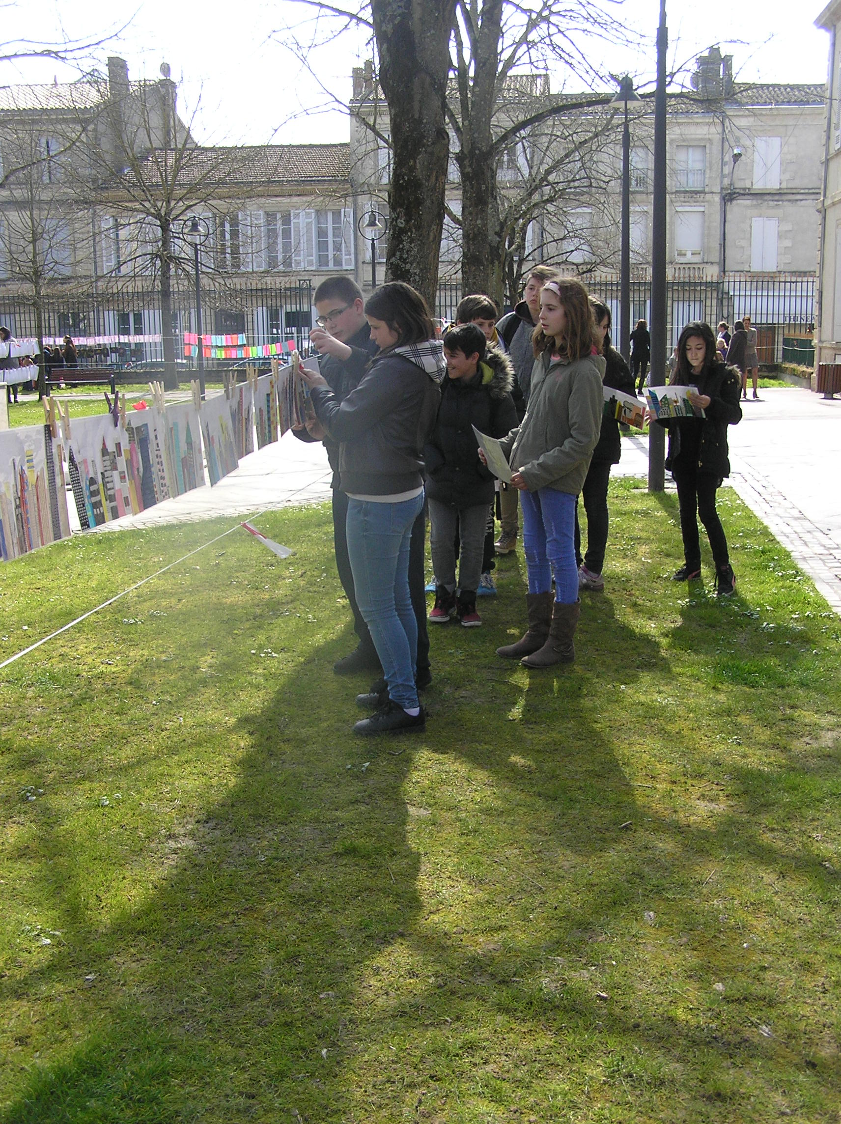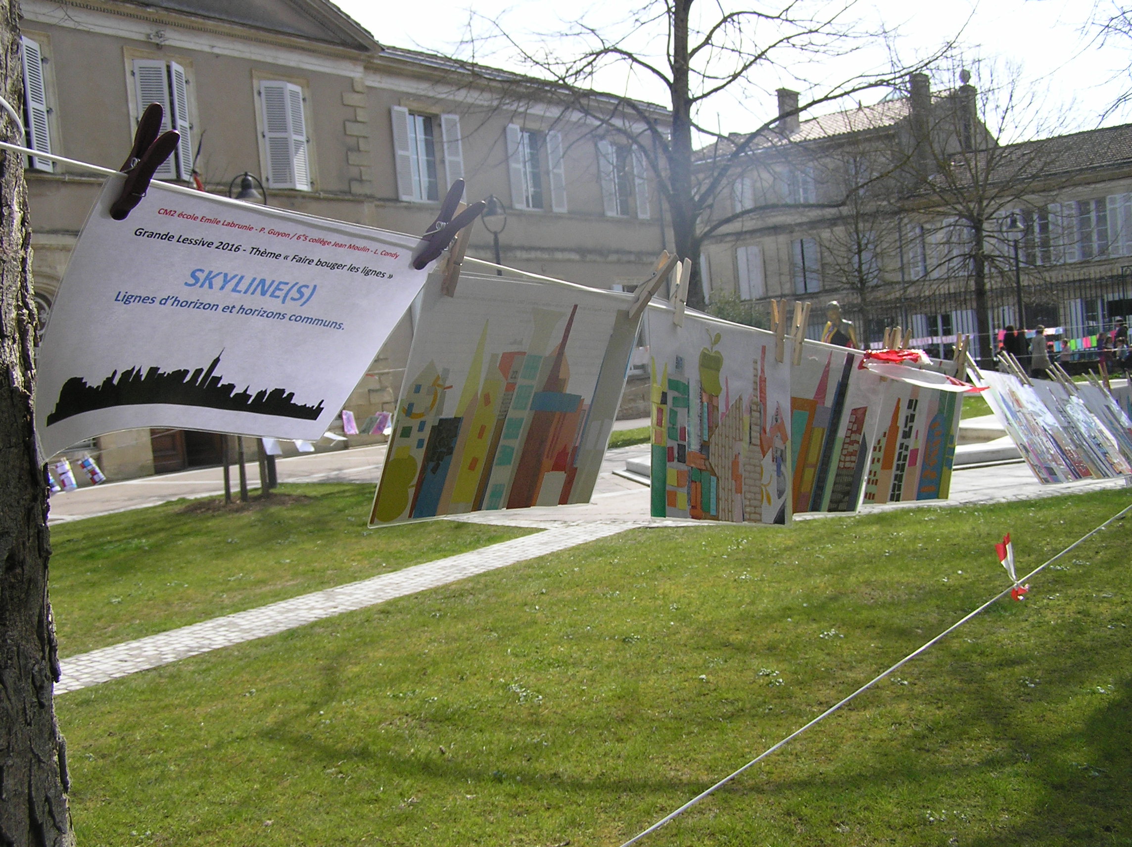 Les 6e5 ont participé le 24 mars dernier à l’exposition internationale d’arts plastiques La Grande Lessive et accroché leurs travaux place de la mairie à Marmande avec leurs camarades de CM2 de l’école Labrunie. Le thème cette année était « Faire bouger les lignes ».  Les 6e et CM2 ont travaillé sur un collage collectif durant tout le mois de mars pour créer une ligne d’horizon géante entre les gratte-ciel et le ciel, une « skyline ».