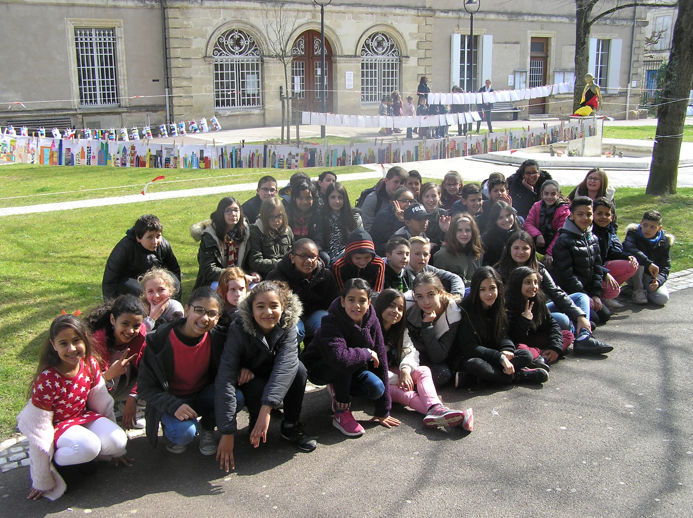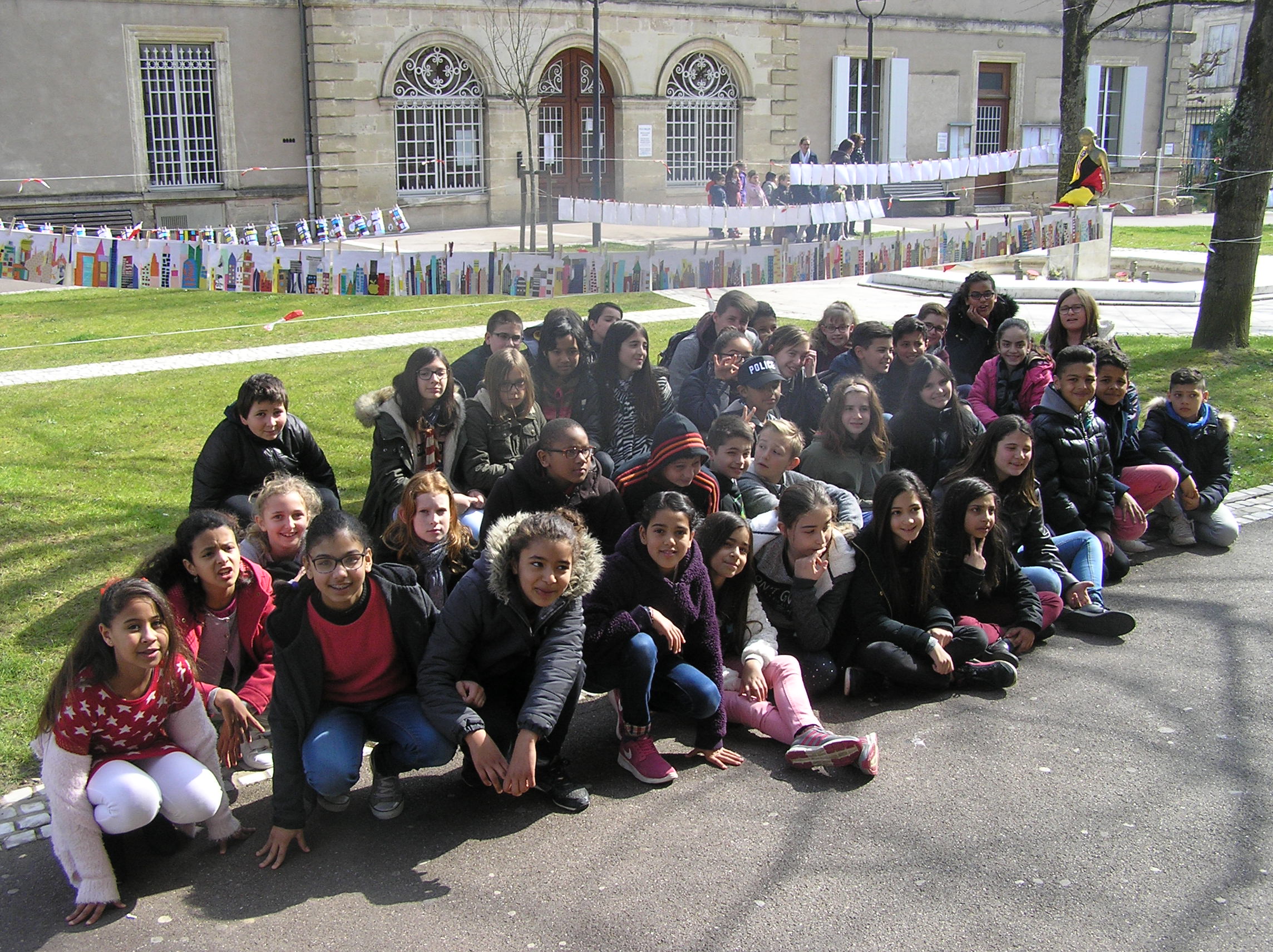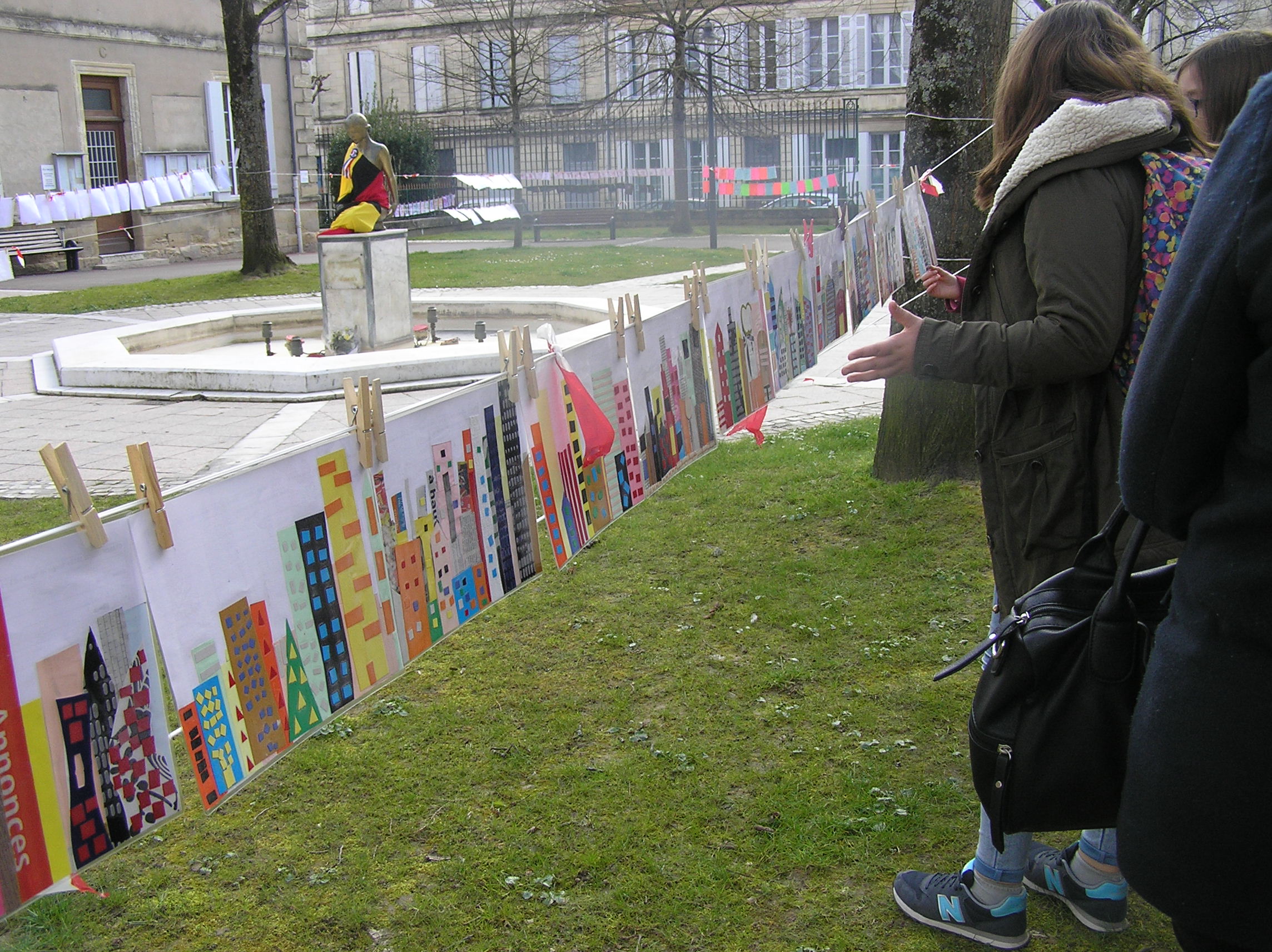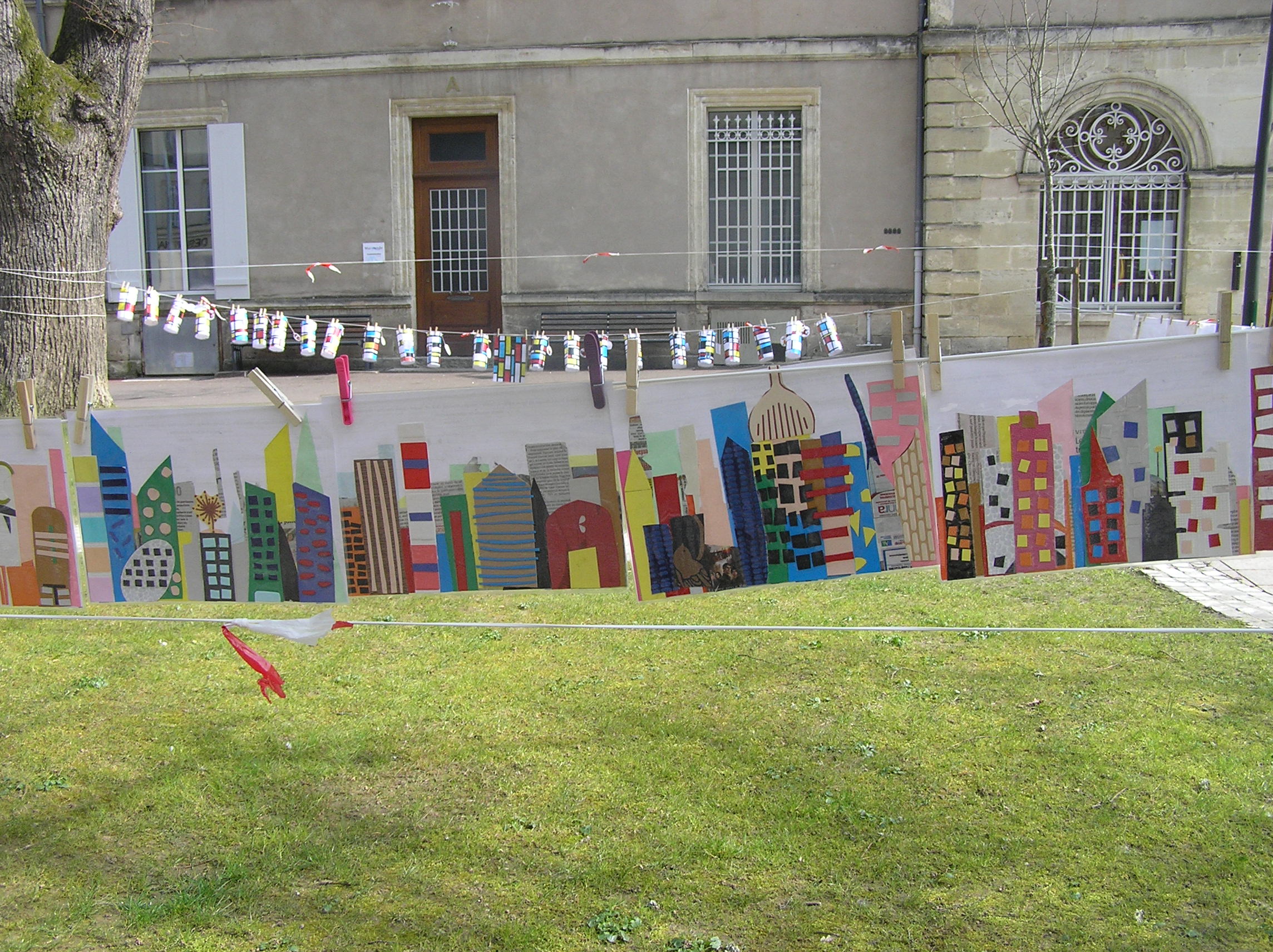 Les 6e5 ont participé le 24 mars dernier à l’exposition internationale d’arts plastiques La Grande Lessive et accroché leurs travaux place de la mairie à Marmande avec leurs camarades de CM2 de l’école Labrunie. Le thème cette année était « Faire bouger les lignes ».  Les 6e et CM2 ont travaillé sur un collage collectif durant tout le mois de mars pour créer une ligne d’horizon géante entre les gratte-ciel et le ciel, une « skyline ».