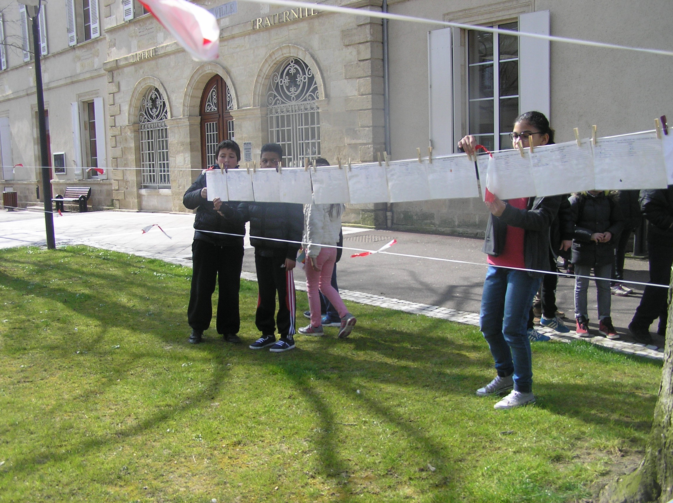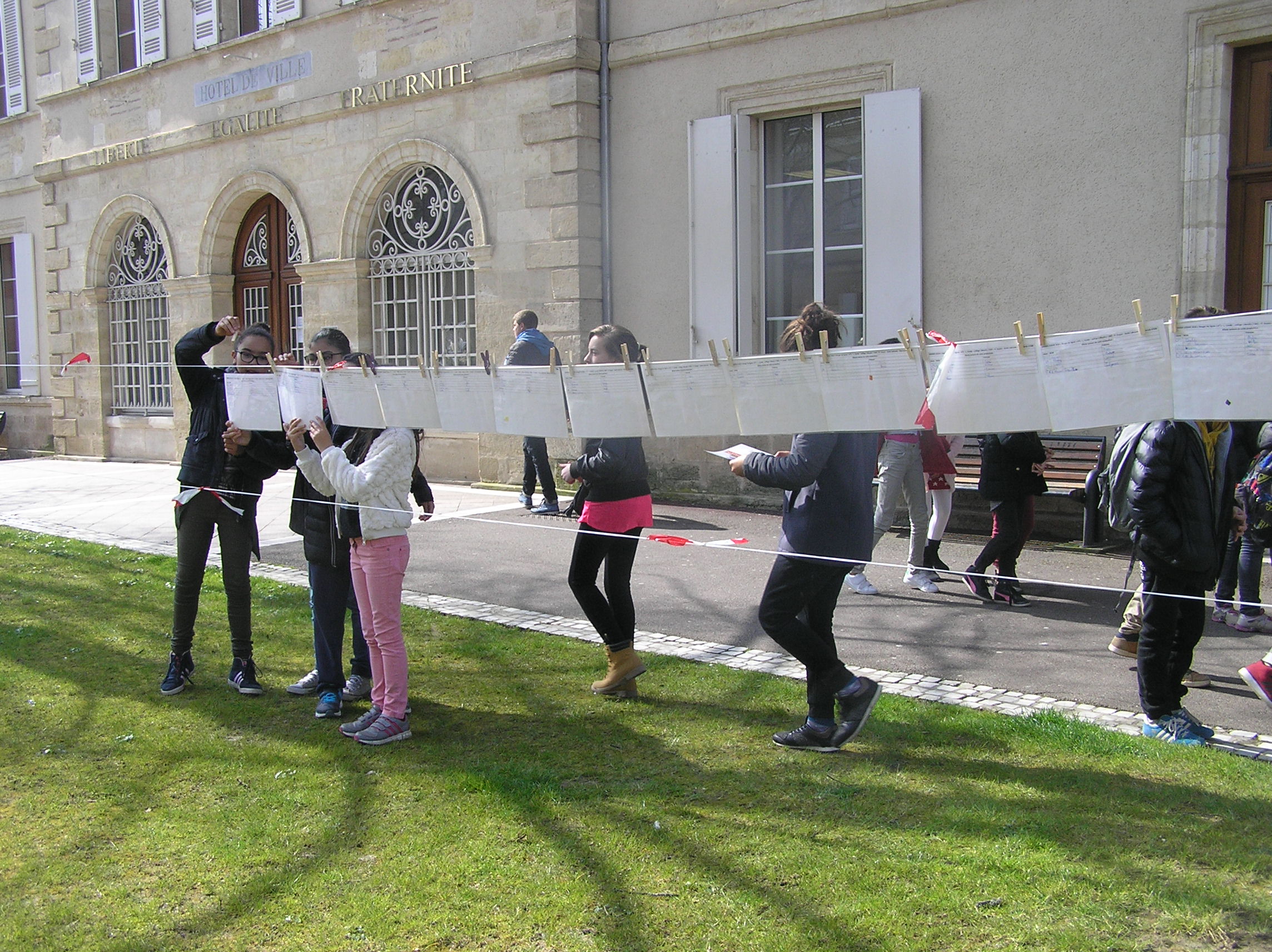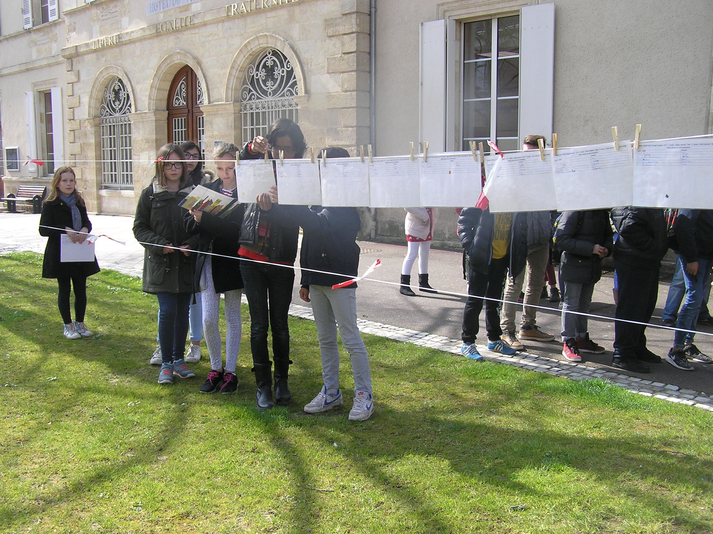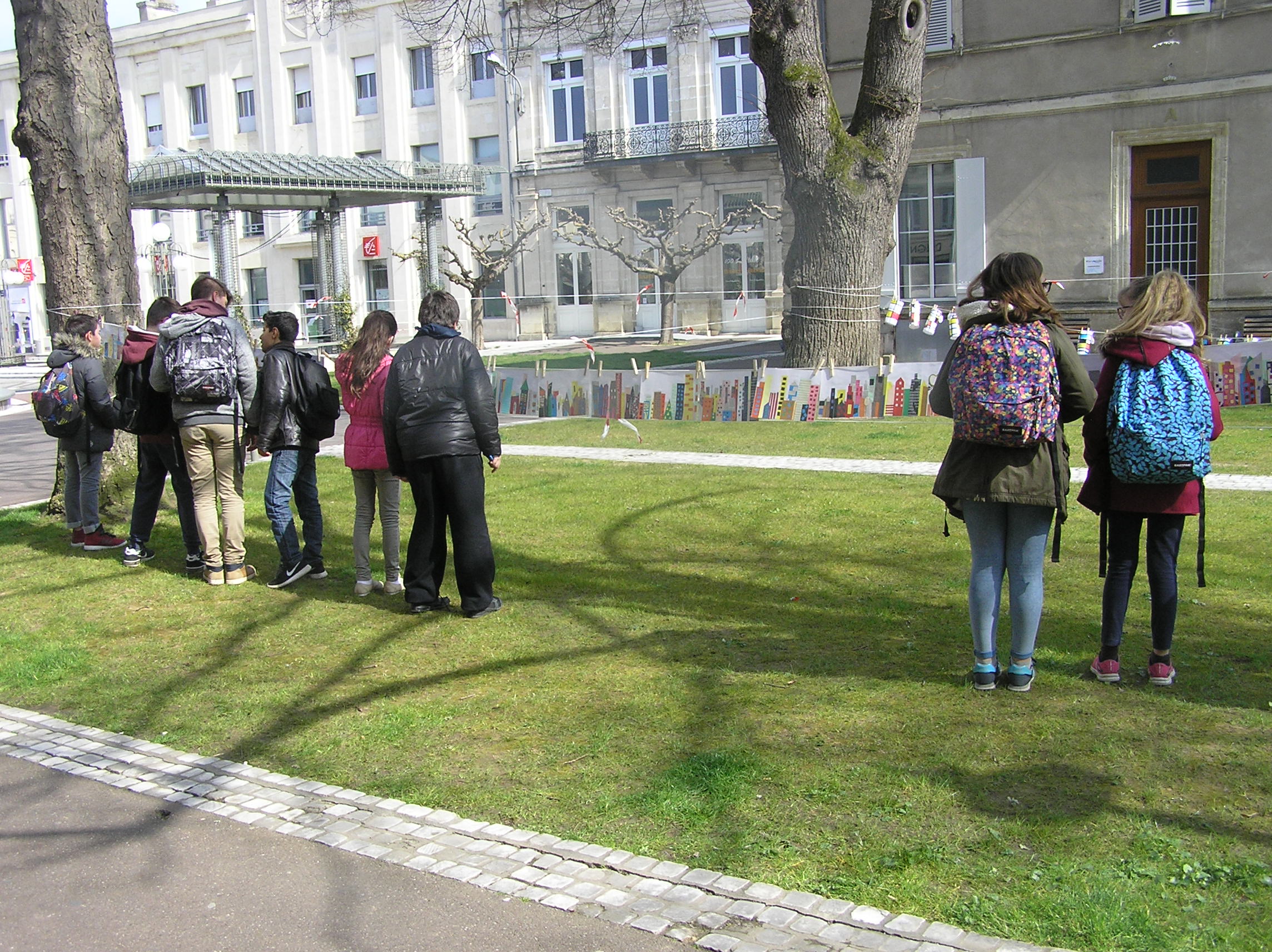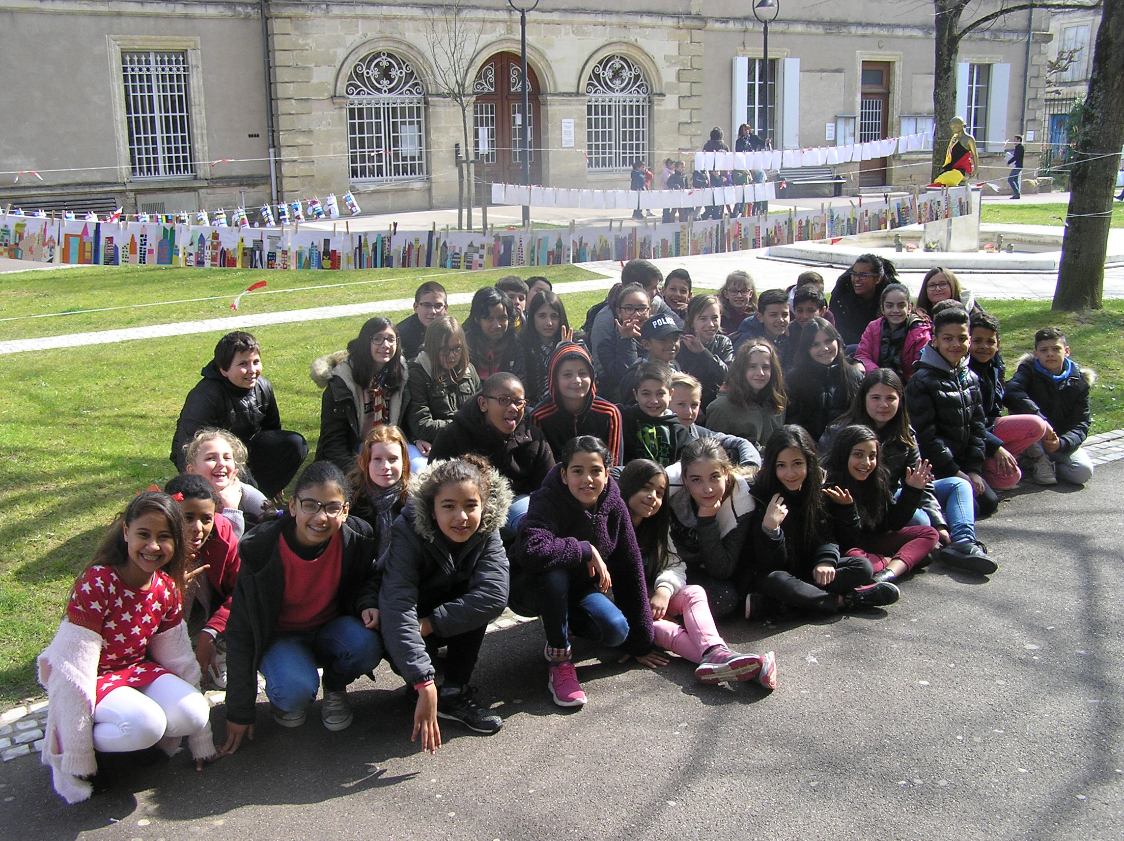 Les 6e5 ont participé le 24 mars dernier à l’exposition internationale d’arts plastiques La Grande Lessive et accroché leurs travaux place de la mairie à Marmande avec leurs camarades de CM2 de l’école Labrunie. Le thème cette année était « Faire bouger les lignes ».  Les 6e et CM2 ont travaillé sur un collage collectif durant tout le mois de mars pour créer une ligne d’horizon géante entre les gratte-ciel et le ciel, une « skyline ».