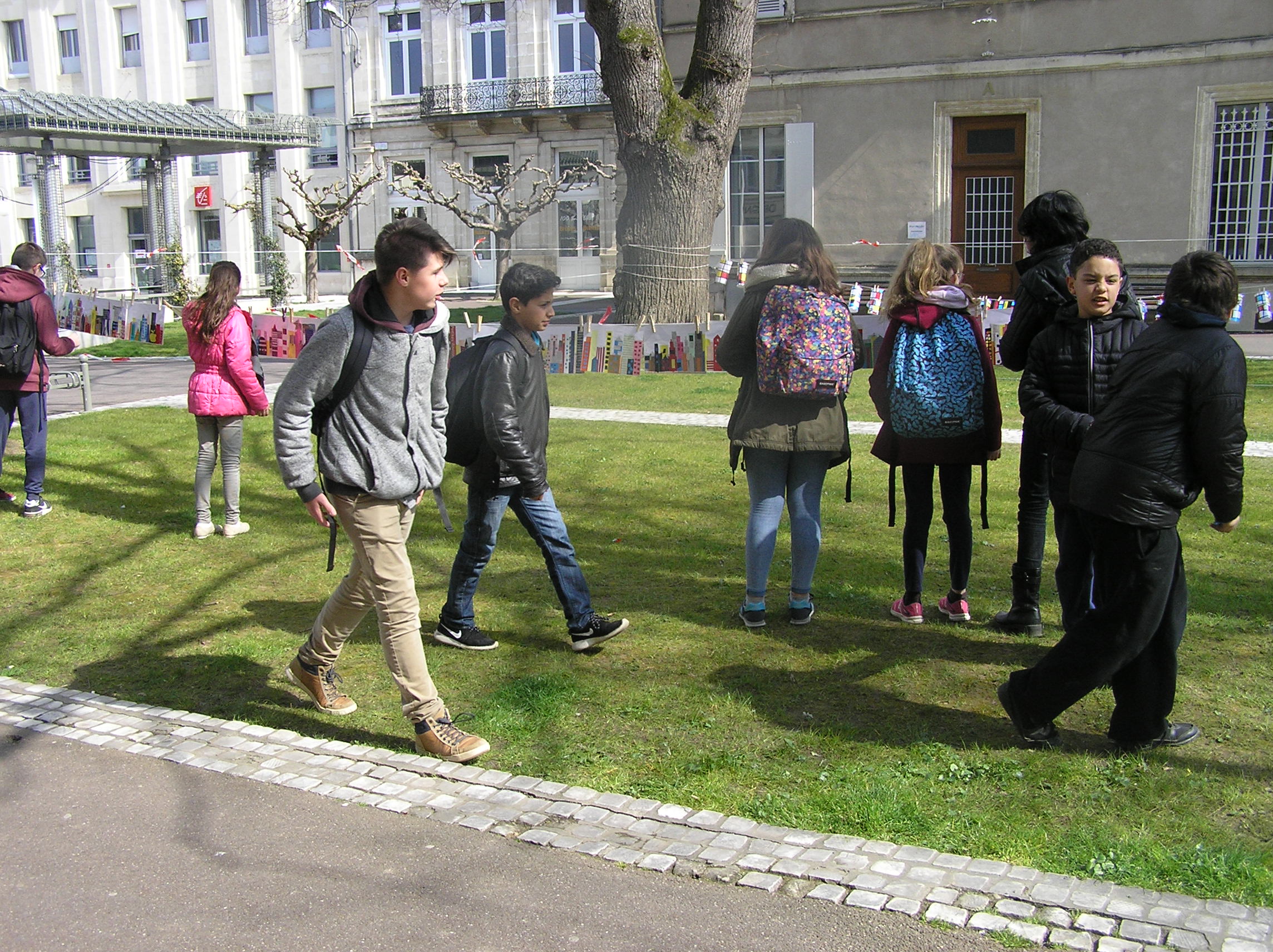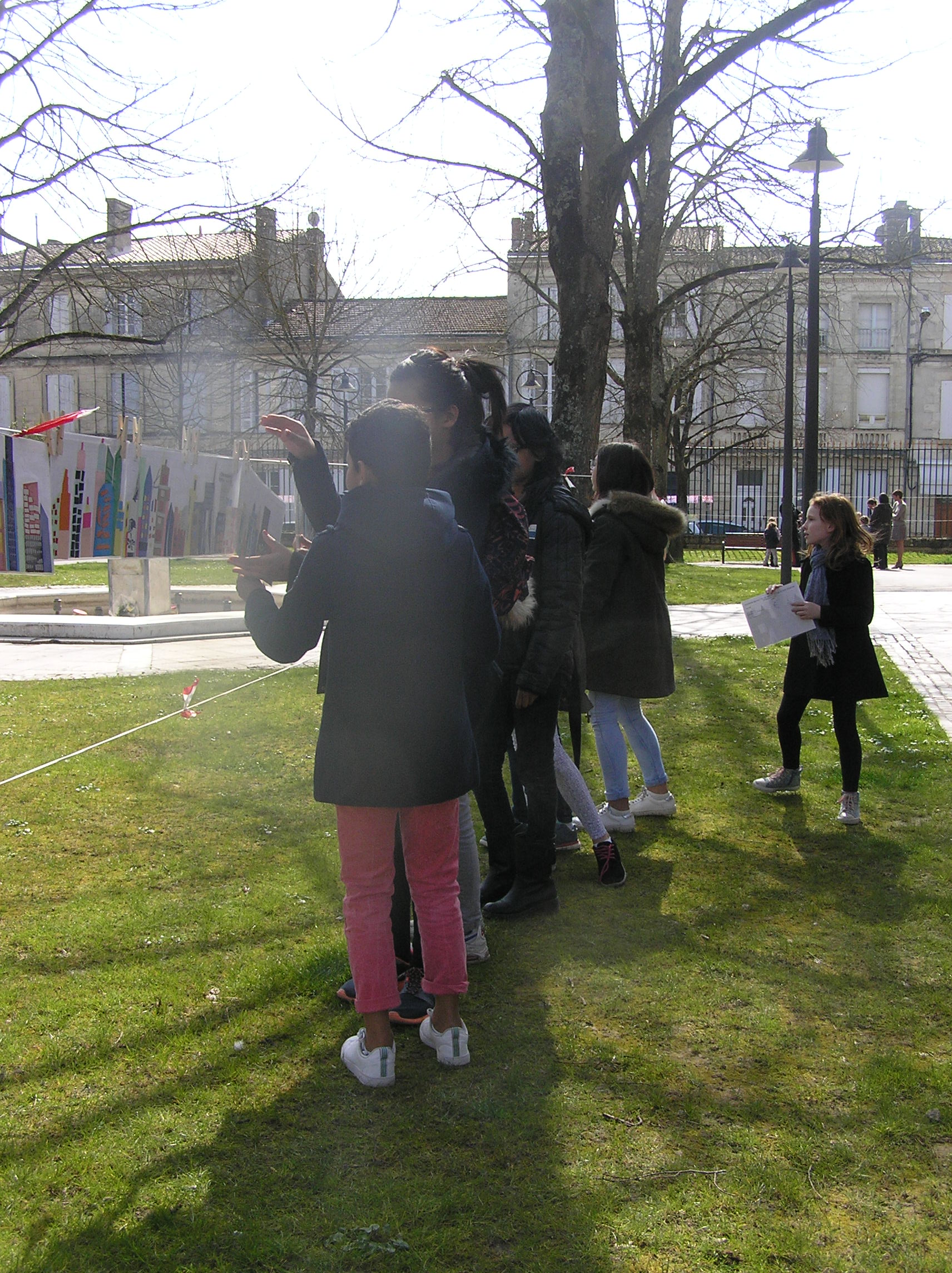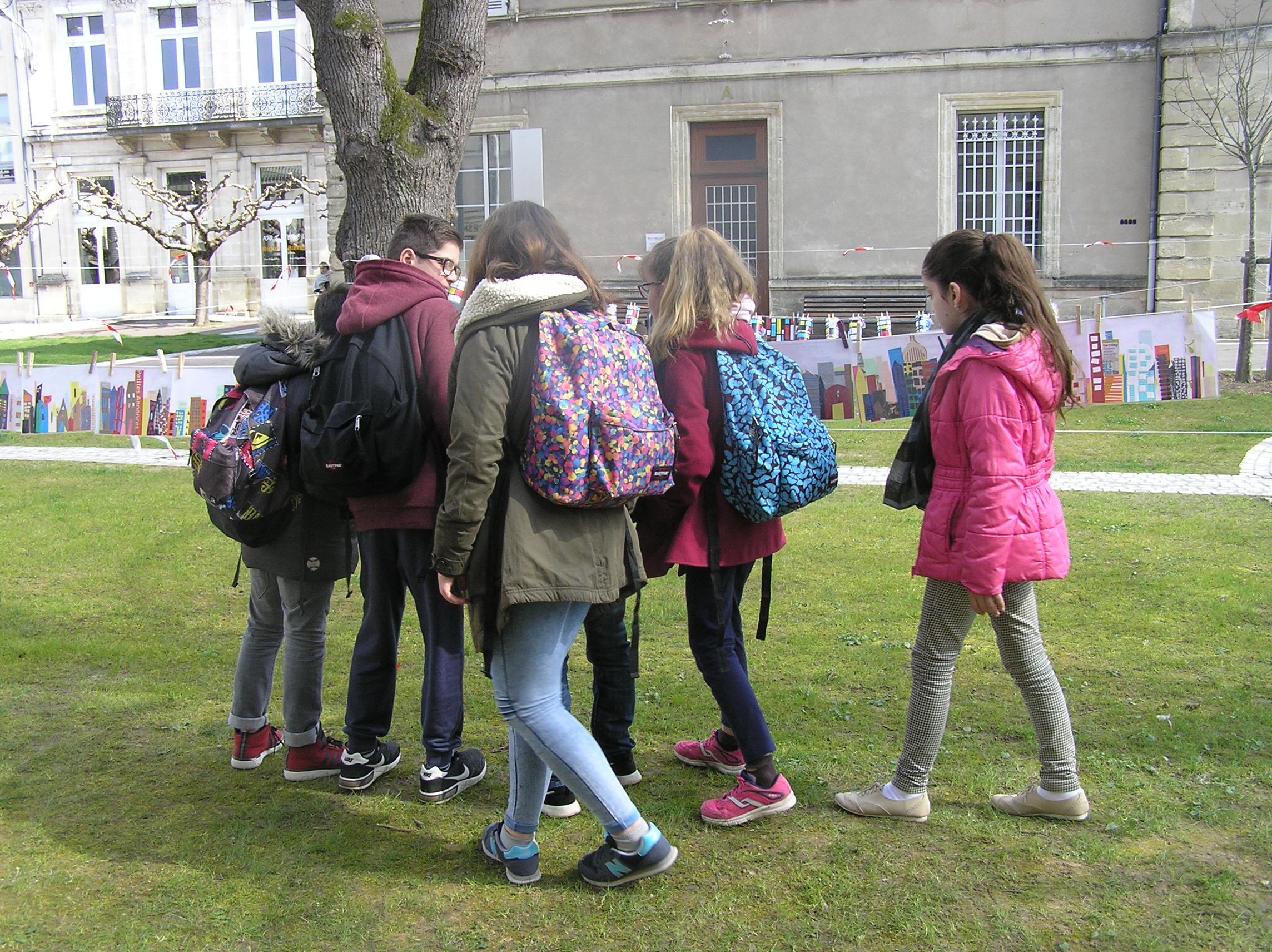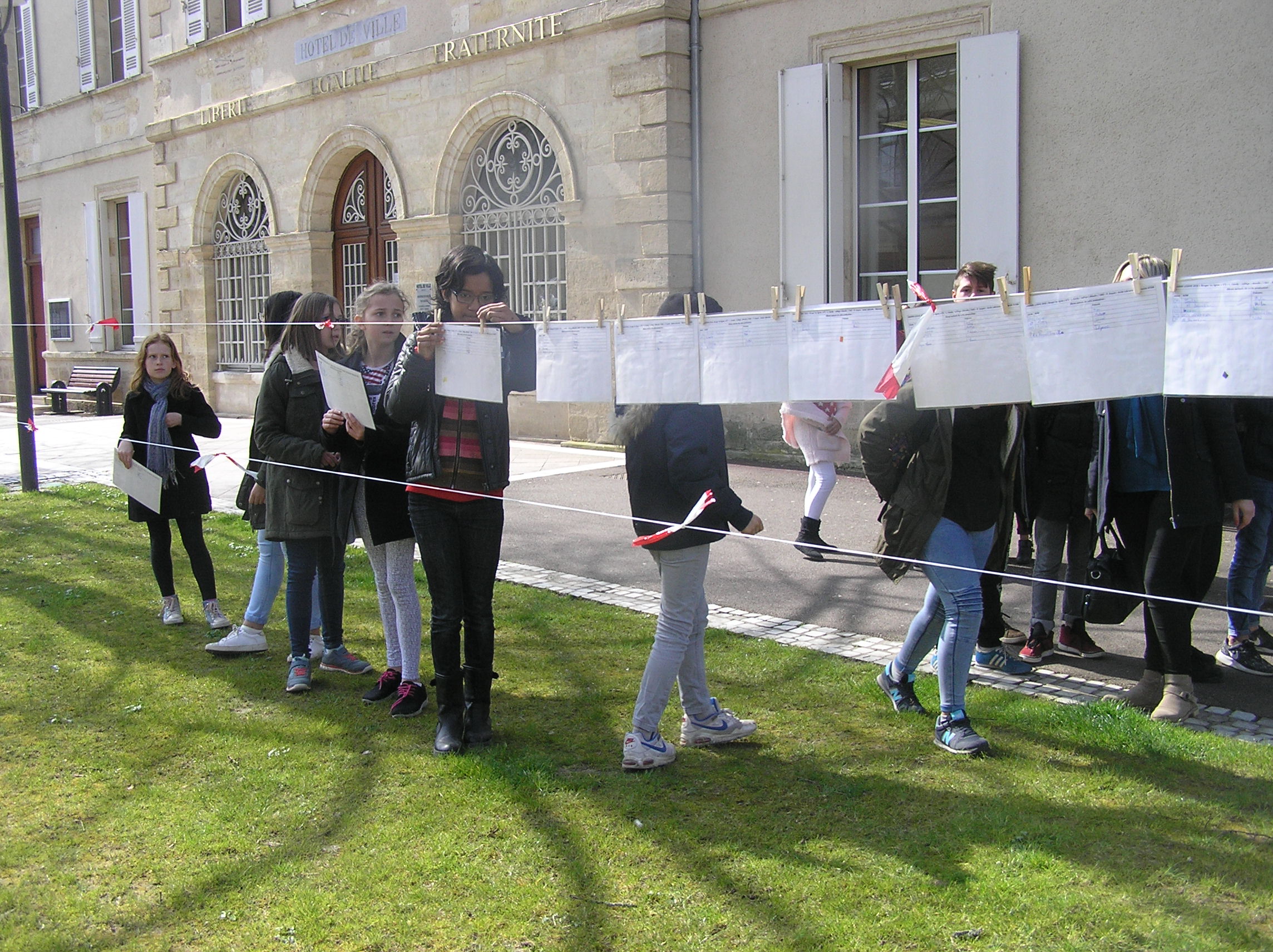 Les 6e5 ont participé le 24 mars dernier à l’exposition internationale d’arts plastiques La Grande Lessive et accroché leurs travaux place de la mairie à Marmande avec leurs camarades de CM2 de l’école Labrunie. Le thème cette année était « Faire bouger les lignes ».  Les 6e et CM2 ont travaillé sur un collage collectif durant tout le mois de mars pour créer une ligne d’horizon géante entre les gratte-ciel et le ciel, une « skyline ».
